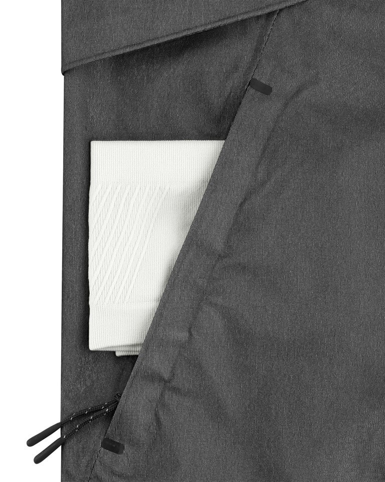 • 3-warstwowa tkanina (3L) – trzy zintegrowane warstwy tworzą spójną całość: materiał zewnętrzny zatrzymuje wiatr i deszcz, membrana wewnętrzna blokuje wodę, a warstwa przy ciele zapewnia przyjemny kontakt ze skórą.