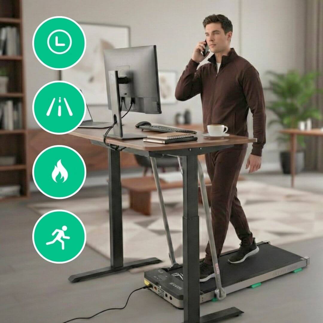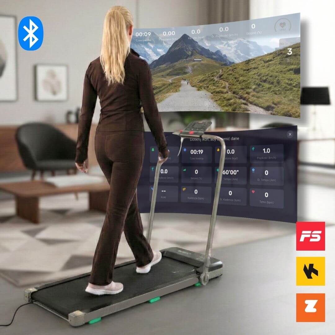 Takie rozwiązanie sprawdza się szczególnie podczas marszu oraz przy użytkowaniu bieżni w trybie niskim, np. przy pracy zdalnej lub pod biurkiem.