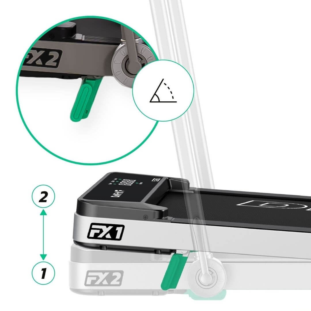 Pionowa kolumna FX2 składa się intuicyjnie i błyskawicznie — po zwolnieniu bocznych zatrzasków uchwyt opada wzdłuż bieżni, tworząc niską konstrukcję łatwą do przechowywania w poziomie.