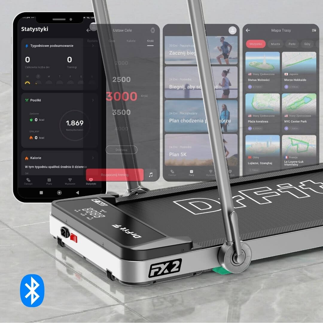 Bieżnia DrFit może współpracować z popularnymi aplikacjami treningowymi, takimi jak FitShow oraz Kinomap, które rozszerzają możliwości codziennego treningu.